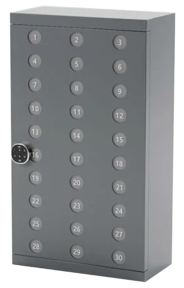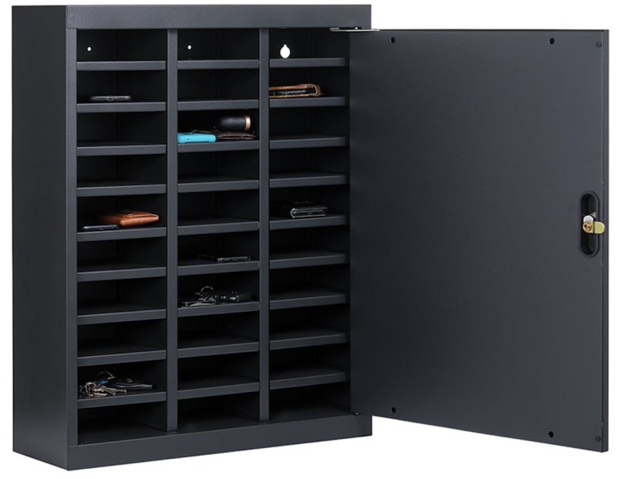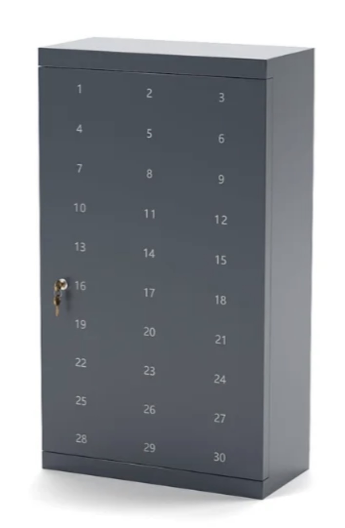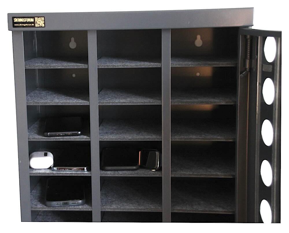 - Velegnet til mobilfri skoler, virksomheder og idrætsforeninger. Solidt stålskab med plads til 30 telefoner / Smartwatch ure eller pung mv. Fremstillet i 0,7mm stål og med en kraftig lågestopper.