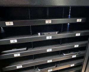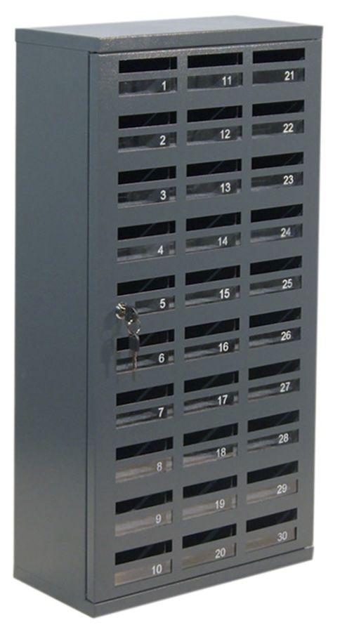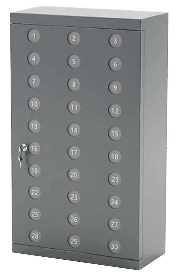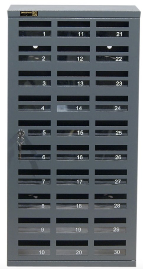 - Stålskabet indeholder tredive rum (nummereret 1 – 30) med plads til ligeså mange telefoner. Skabet monteres på væggen. Aflåsning med cylinderlås, så der ikke er nogen fare for en tyv kan få fingre i telefonerne.