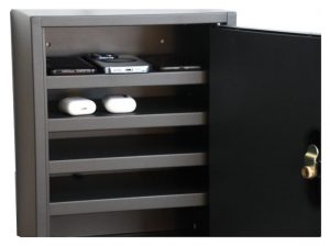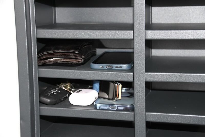 - Velegnet til mobilfri skoler, virksomheder og idrætsforeninger. Solidt lille stålskab med plads til 12 – 15 telefoner, Smartwatch ure eller pung mv. Fremstillet i 0,7mm stål og med en kraftig lågestopper.