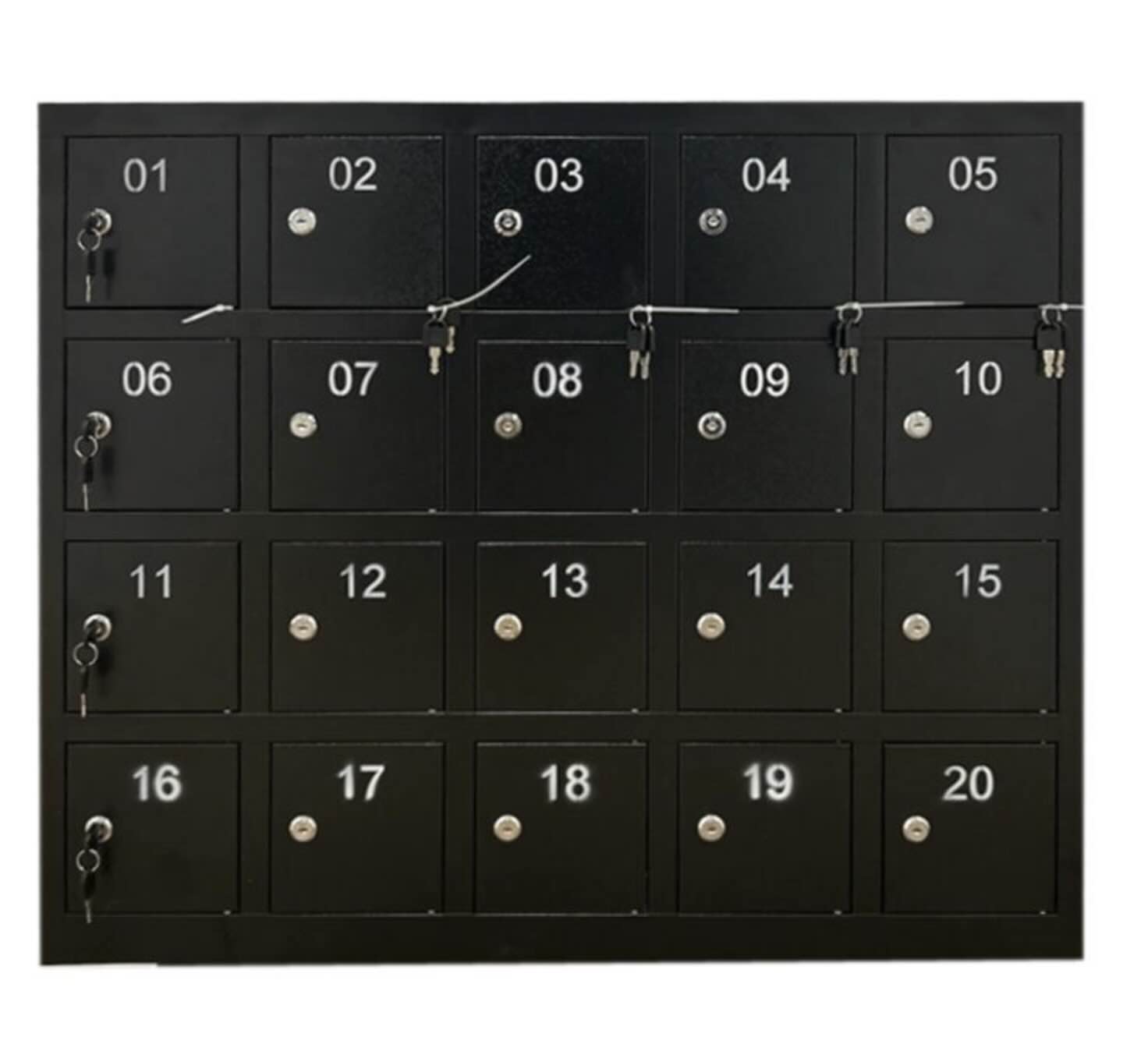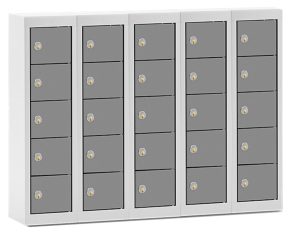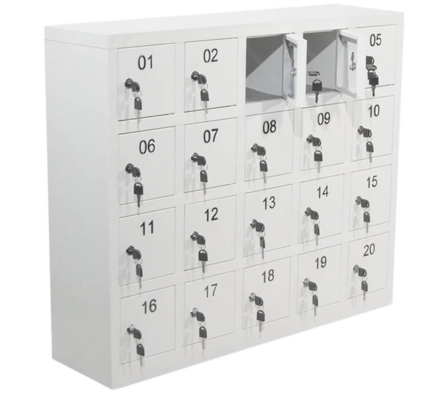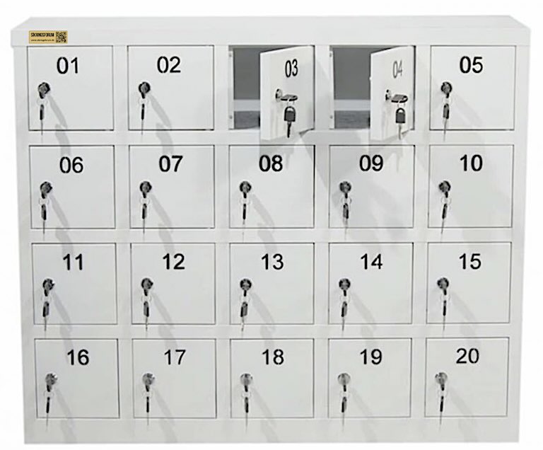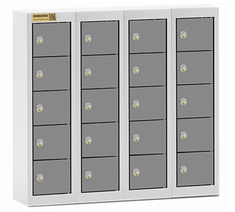 - NYHED Stålskab med individuelle rum velegnet til mobilfri skoler. Hver elev får deres egen rum og en nøgle der kun passer på deres låge. Lågerne er nummereret fra 1 – 20. Alle rum er filtbelagt for at undgå stødskader og ridser i mobiltelefonerne.